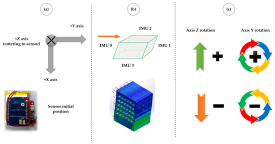 Figure 5a presents the sensors’ initial reference system (when installed on the walls). Two axes are used to measure the building’s tilt. The Y–Z plane represents the biaxial tilt, allowing the IMUs to be easily powered regardless of their location on the building walls. A generic building illustration is presented regarding the walls’ inclination. Figure 5b illustrates pattern 0, where all four walls tilt to the right. Figure 5c shows the rotation of the axes Y and Z, regardless of their location on the building walls.