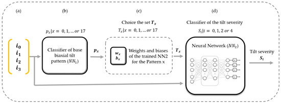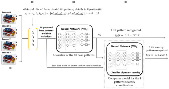 The model uses artificial neural networks for base tilt pattern recognition and its severity classification. Figure 8 illustrates the general diagram of the classification model. Figure 8a,b shows the four sensors and the four biaxial tilts, respectively. Figure 8c is the classifier of base patterns. Figure 8d is the computer model for the pattern severity classification, which includes the neural network and an algorithm, which is detailed in Section 2.6.1.