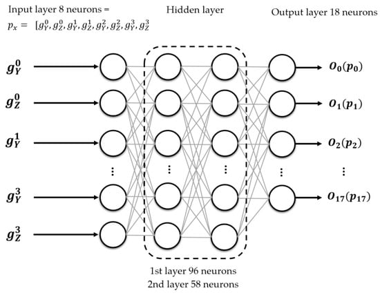 had eight input neurons, where ( represent the four ordered pairs of inclinations in the Y- and Z-axes for the four building walls. It had two hidden layers (96 and 58 neurons, respectively) and a layer of 18 output neurons to classify the 18 base patterns. According to a set of tests and the range of inclinations to be monitored for this work (−1.5° to 1.5°), the hyperbolic tangent activation function () was used to process each of the outputs () with m = 0, …, 17.