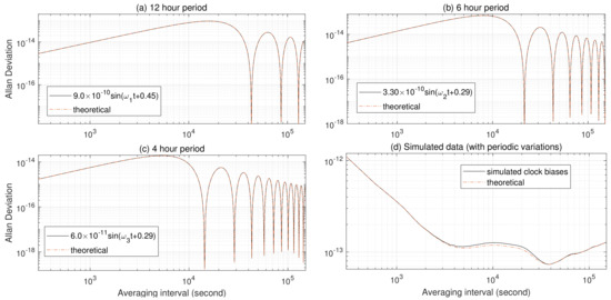 AVARs of simulated clock data 12-, 6-, 4-, and 3-hour periodic variations fitted and removed by least squares and by Equation (9), respectively.