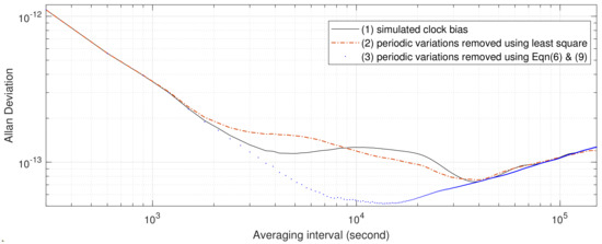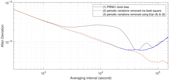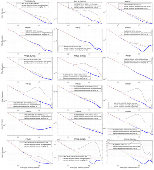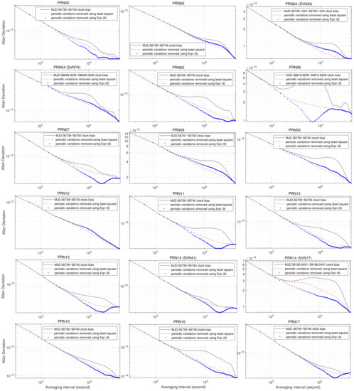 It can also be observed from Figure 4, Figure 5 and Figure 6 that the AVARs computed from clock biases with periodic variations fitted and removed using Equation (9) are always smaller than the AVARs computed from IGS final combined clock biases, and the two coincide at averaging intervals greater than s. For most cases, this also holds for AVARs estimated from clock bias with periodic variations fitted and removed using the least squares method. There are only two exceptions:
