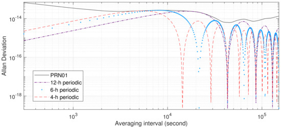 - The gap between the AVAR estimated from PRN01 clock bias with periodic variations fitted and removed using the least squares method and the AVAR computed from PRN01 clock bias enlarges with increasing averaging interval. Since the tail of AVAR estimated from PRN01 clock bias with periodic variations removed using the least squares method has a similar shape to the AVARs of 12-hour sinusoidal variations, and the AVAR computed from PRN01 clock bias with periodic variations fitted and removed using Equation (9) suggests strong frequency noise, the discrepancies between the AVAR estimated from PRN01 clock bias with periodic variations fitted and removed using the least squares method and the AVAR computed from PRN01 clock bias is caused by overfitting the periodic variations by taking a portion of frequency noises as 12-hour variation.