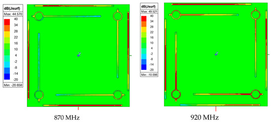 Figure 2. At 870 MHz, surface currents are strong on the driven elements with low intensity on the parasitic elements. At 920 MHz, the driven elements excite the parasitic element and strong current intensity is visible on both branches.