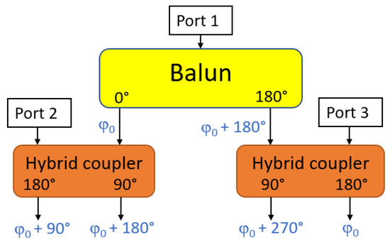 In order to miniaturize the circuit, the proposed feeding network consists of a balun and two hybrid couplers, as shown in