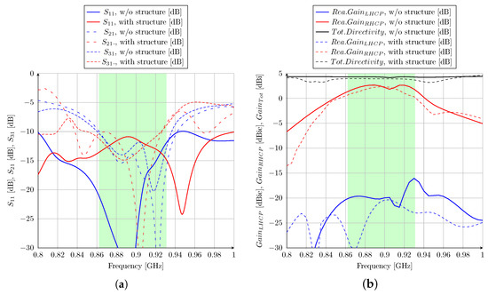 Figure 1. Then, the case of “with structure” refers to the antenna mounted on the 3U CubeSat metal frame. In this case, the satellite structure is added and analyzed to verify its influence on the antenna features. As shown in