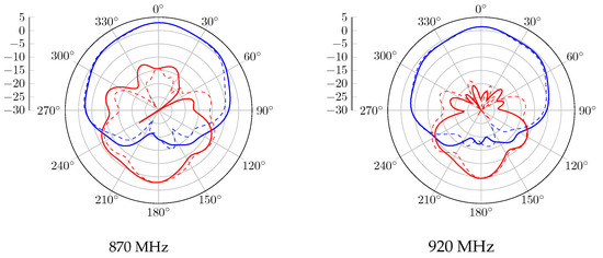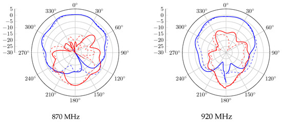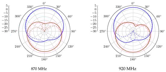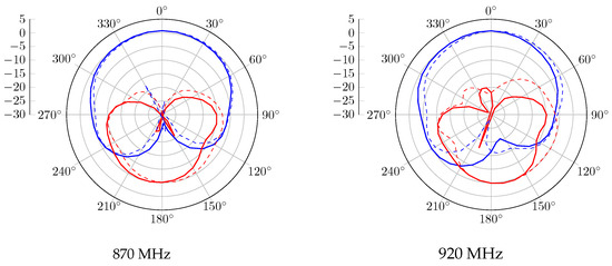 For the antenna alone, the radiation patterns of the real gain at 870 MHz and 920 MHz are shown in