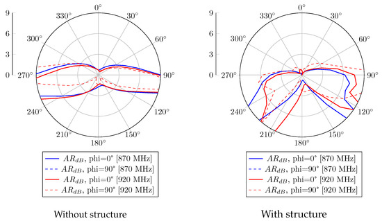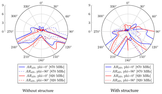 at 870 MHz and 920 MHz, respectively. The axial ratio level versus theta for different configurations is also computed and shown in
