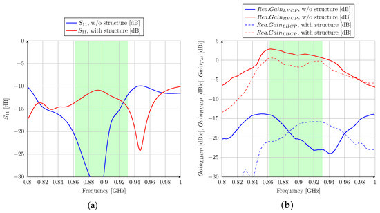 The measured reflection coefficients of the antenna without and with the structure are presented in
