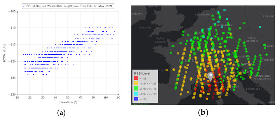 32] and an electronic module based on the SX1262 transceiver was used as the terrestrial receiver. The receiving antenna provides a 2.5 dBic realized gain at zenith and was placed 10cm above the ground using a tripod. It should be noted that no additional radio frequency components (low-noise amplifier, filter, etc.) were used during the experiment, which confirms the capability to receive a broadcast signal from LEO orbit with a low-cost and low-power consumption terminal. The Received Signal Strength Indicator (RSSI) was extracted for every received packet. The left part of