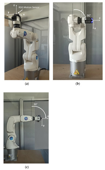 Sensor placement on the industrial robot arm: (a) sensor coordinate system in reference to the robot in the starting position, (b) an angle of 90° of rotation around the y axis (pitch movement) with a frontal view of the robot, (c) an angle of 90° of rotation around the x axis (roll movement) with a side view of the robot. Own source.