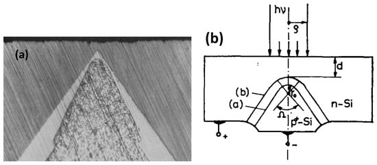 Spherical APD design: (a) the n−Si monocrystal substrate, the cone of Au-Si eutectic granular p+Si, and the bright zone of recrystallized p+Si diffusion; (b) the APD layout: the metallurgical p–n junction is marked by the line (a) and the depletion region is marked by the line (b); see explanations of other symbols in the text. Reproduced with permission from [33]; published by Elsevier, 1968.