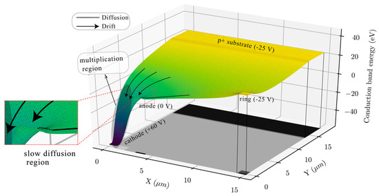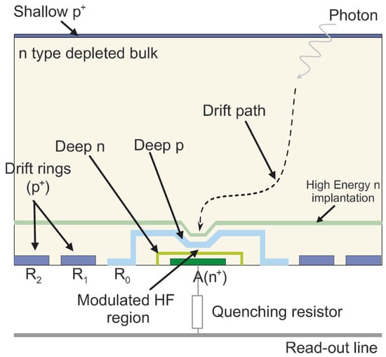 Initially, the Max Planck Institute team proposed an SDD-inspired concept of the avalanche drift diode and modeled its structure and electric field distributions [54]. In the next years, they adjusted the implantation profiles to optimize the collection and multiplication of signal electrons in the modified version of the avalanche drift diode, the BID SiPM [55,56], as shown in Figure 5.
