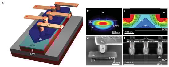 In contrast, the IBM Watson Research Center team led by Yurii Vlasov developed an original CMOS-compatible lateral receiver design—waveguide-integrated Ge APD as they focused on optical interconnects ranging from data centers and mainframes to board-to-board and on-chip levels ([64], Figure 7). The authors pursued a set of contradictory demands: “ideally the APD should have a compact micrometer-scale footprint, operate at a voltage close to 1 V that is compatible with complementary metal oxide semiconductor (CMOS) technology, possess high avalanche gain, and detect very fast optical signals of up to 40 gigabits per second. These requirements are in strong contradiction to each other and are almost impossible to meet without significant innovations.”