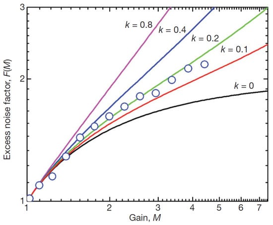 This ENF behavior was qualitatively and quantitatively explained by history-dependent ionization theory taking into account a unique conduction and valence band structure of HgCdTe with ballistic electron transport due to low phonon scattering [67,68]. As discussed in [66]: “Ballistic ionization results in a non-random, history dependent, deterministic ionization process, as opposed to the random, history independent process originally treated by McIntyre. The deterministic process thus removes the factor of two in excess noise in the case k = 0 and thus creates the condition of near “noiseless” gain.”