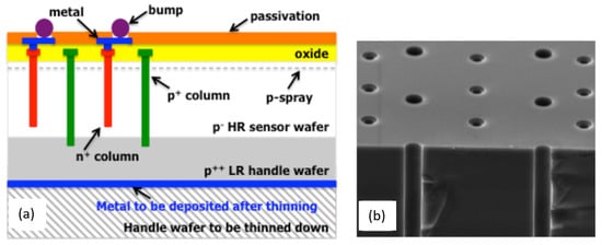 Three-dimensional silicon detector design: (a) cross-section of double-sided 3D silicon detector modification for HL-LHC CERN experiments; (b) SEM micrograph of two sets of columns etched by deep reactive ion etching. Reproduced with permission from [72]; published by Elsevier, 2016.