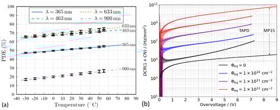 - Schmailzl, W.; Piemonte, C.; Schelhase, S.; Hansch, W. Characterization of the photo-detection efficiency temperature dependence of silicon photomultipliers from −30 °C to 70 °C. J. Instrum. 2022, 17, P12009. [Google Scholar] [CrossRef]