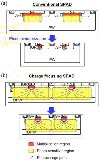 - Morimoto, K. Charge-Focusing SPAD Image Sensors for Low Light Imaging Applications. In Proceedings of the International SPAD Sensor Workshop (ISSW 2020), Edinburgh, UK, 8–10 June 2020. [Google Scholar]