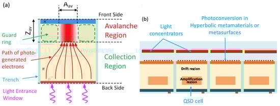MRS APD design based on n+ diffusion dots with individual SiC or polysilicon (marked as Si) resistors. Pink arrows represent incident photons, blue dots represent photoelectrons, blue arrows represent drift directions. Reproduced with author’s permission from [44].