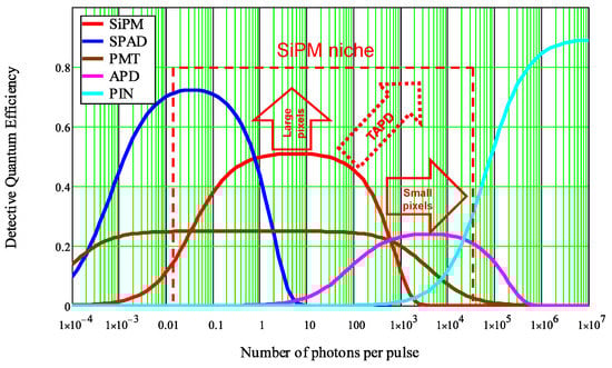 - The first issue is a trade-off between geometric efficiency (and, hence, PDE) and dynamic range: the larger the cell size, the higher ratio of active area to inactive area (PDE), and the lower total number of cells per SiPM area, i.e., the dynamic range of the SiPM. Moreover, larger cells with larger capacitance have a longer recovery time, affecting the dynamic range in CW and long light pulse detection modes [30,31].