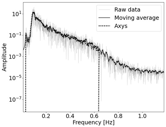 Frequency amplitude spectrum, integrated over one example run. “Raw data” consists of the raw frequency spectrum without any pre-processing procedure. A moving average on the raw data is also reported to smooth the statistical fluctuations. The spectrum generated by the buoy onboard software is labelled as “Axys”.