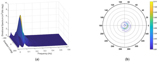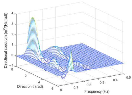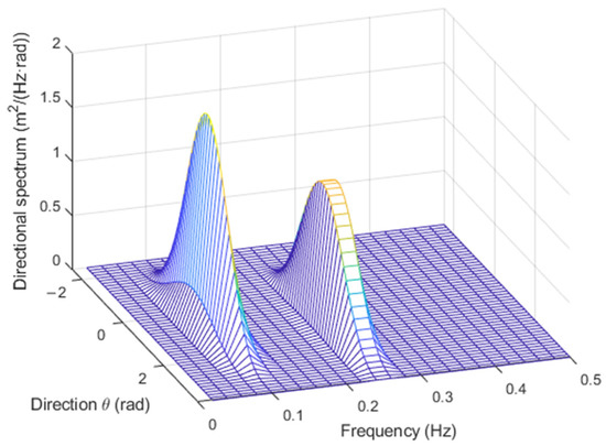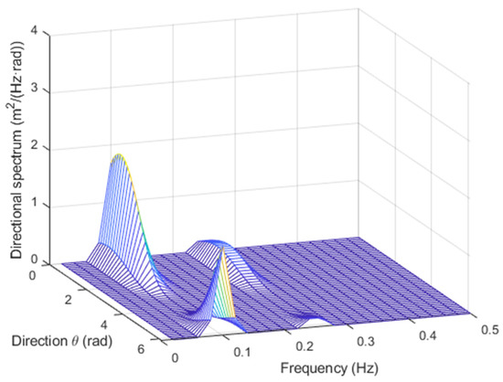 with , where is the n-th wave height, and , where is the n-th wave period. For example, for , m, m, s, s, , and , with the TFS approach, the directional spectrum in Figure 2 was obtained, and with the WTFS method, the one in Figure 3 was obtained.