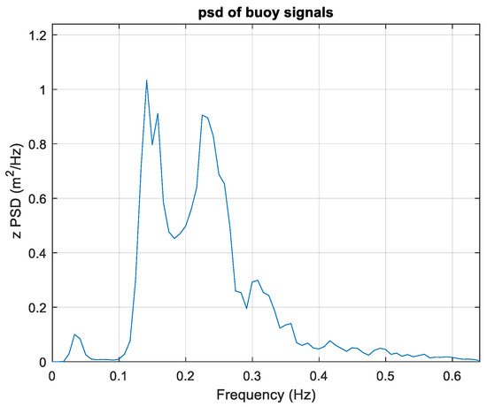 Concerning spectrum estimation, the observation conditions were similar to those in the previous case; therefore, the same estimation parameters were used, with, in particular, s. Both the TFS and WTFS approaches were applied. The non-directional (heave) spectrum is reported in Figure 16, and the directional one, obtained by the WTFS approach, is displayed in Figure 17.