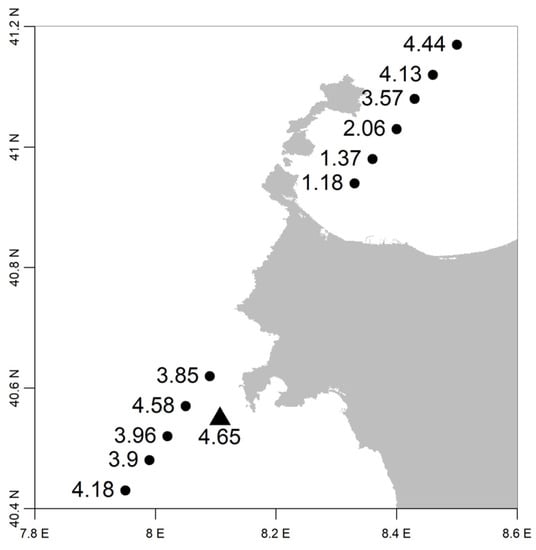 Significant wave heights (in meters) near the Alghero buoy on 20 February 2010; triangle: value observed by the buoy at 9:30 UTC; circles: values observed by satellite altimeter Jason-2 at 9:18 UTC.