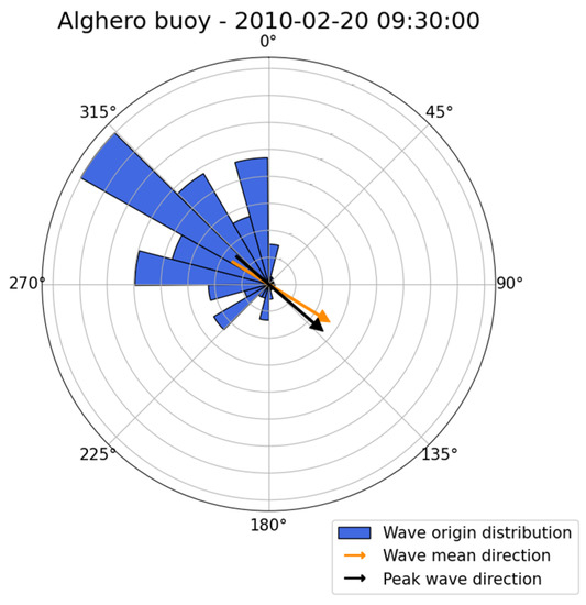 The run considered is 20 February 2010, 09:30 UTC, which features a value for of . The outcome of the directionality analysis is reported in Figure 23, and the convention follows the same rules adopted for Figure 15 and Figure 19. The directional distribution confirms a strong northwest component.