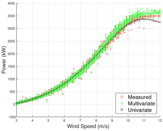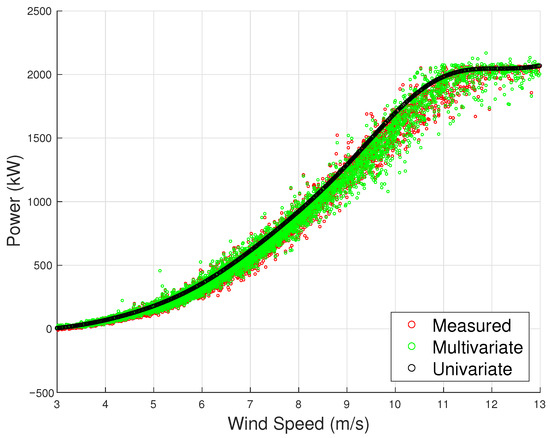 The measured power curve and the estimated one through the multivariate and univariate model, Test Case 2.