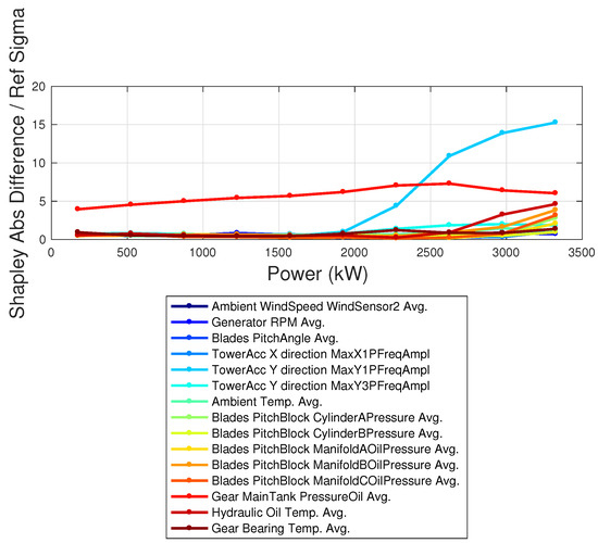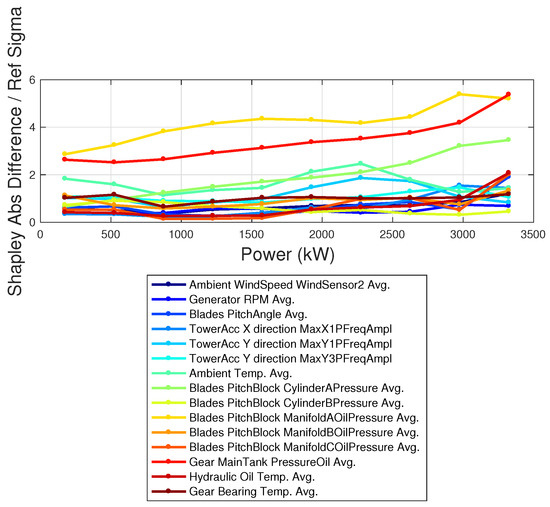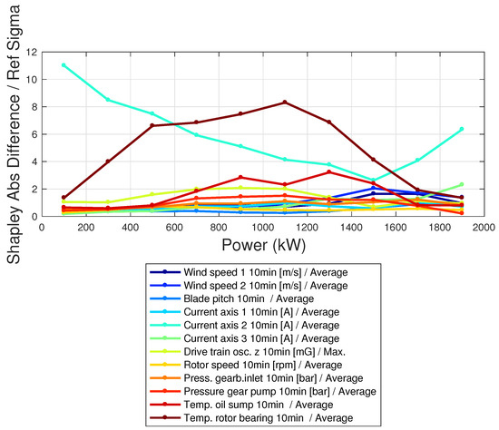 The Shapley coefficients are computed using the data of the target wind turbine with the model trained on the reference wind turbine. The difference between the average Shapley coefficients of the target and reference wind turbines is shown in Figure 13. In Figure 14, the absolute difference between the Shapley coefficients of the reference and target wind turbines is reported, in units of the standard deviation, as a function of the power of the target wind turbine. From Figure 14, it follows that an anomaly above 3 occurs for the pitch motor of blade 2 in the target wind turbine and for the temperature of the rotor bearing. Furthermore, Figure 14 highlights that the anomaly at the blade pitch motor is especially high for low powers and for high powers, which are the regimes where the blade pitch works most. The anomaly at the rotor bearing temperature instead is most remarkable in the regime of variable rotational speed, which is reasonable because of more rotational speed and more heat. The application of XAI techniques to a multivariate data-driven model with multiple input variables therefore provides a novel insight for understanding the reasons behind the observed underperformance and for identifying anomalies that would be invisible through naive scrutiny.