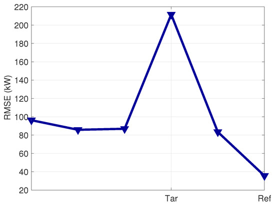 RMSE for the evaluation of the model trained with the data of the Ref wind turbine on all the wind farm, Test Case 2. The Ref and selected Tar wind turbines are indicated.