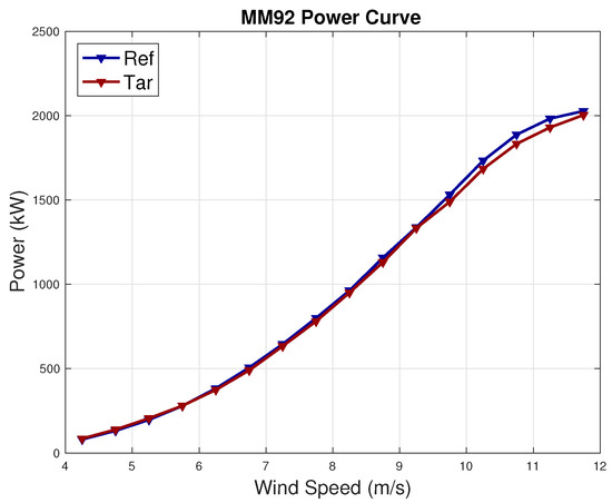 Average power curve of the reference and target wind turbine in Test Case 2.