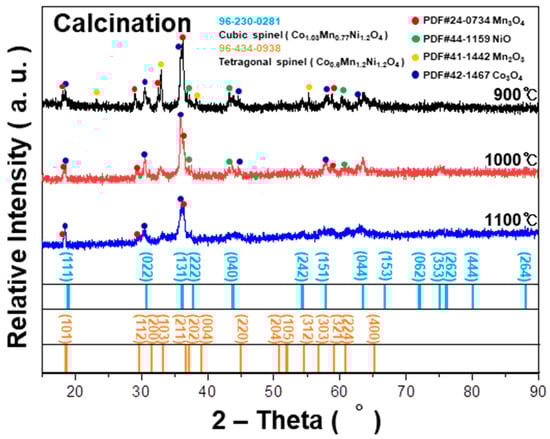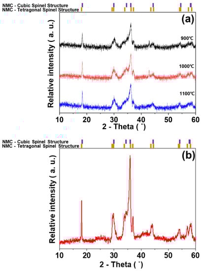 The effect of calcination temperature on the crystal structure of the NMC is depicted in Figure 1. As the calcination temperature increases up to 1100 °C, the main phase shifts to a mixed cubic and tetragonal spinel structure [1,15].