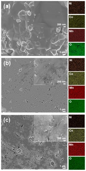 Microstructure evolution of the NMC powders, calcined at elevated temperatures up to 1100 °C, is displayed in Figure 3 and Figure 4, which indicates that microstructure analysis and corresponding EDS maps of the NMC samples prepared via both one-step and two-step SSR routes demonstrate a dense microstructure with uniform distribution of Co, Mn, and Ni throughout the microstructure.