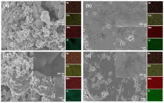 SEM images of the NMC (a) after calcination at 900 °C (two-step SSR route), (b) after calcination at 900 °C followed by sintering (two-step SSR route), (c) after calcination at 1000 °C (two-step SSR route), and (d) after calcination at 1000 °C followed by sintering (two-step SSR route).