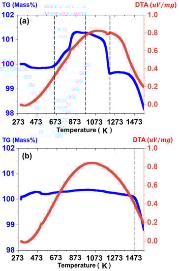 To understand the chemical reaction and sintering behavior during the one-step SSR route, thermo-gravimetric analysis was performed, and the result is shown in Figure 5a. Initial weight loss was observed in the NMC when the temperature was increased to 390 °C due to the evaporation of surface-absorbed water [18]. Further heating to 550 °C increases the weight in the NMC, accompanied by an exothermic reaction related to the oxidation of Mn3+ cations on octahedral sites [19]. Additionally, weight loss with endothermic reaction at 945 °C provides strong evidence that the formation of spinel NMC structure occurs. Further heating to 1250 °C leads to gradual weight loss, which implies that sintering takes place for the densification of the NMC pellet. For comparison, TG-DTA data of the calcined NMC at elevated temperature is also presented in Figure 5b.