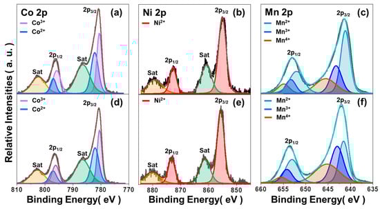 XPS spectra of (a) Co 2p, (b) Ni 2p, and (c) Mn 2p of the NMC via two-step SSR route (calcination temperature: 1100 °C), and (d) Co 2p, (e) Ni 2p, (f) Mn 2p of the NMC via one-step SSR route.