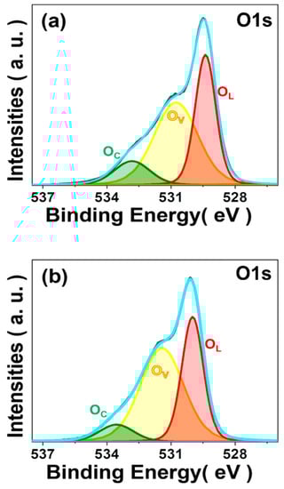 XPS spectra of O 1S of the NMC (a) via the two-step SSR route (calcination temperature: 1100 °C), and (b) via the one-step SSR route.