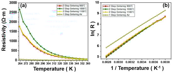 Both NMCs prepared via the different processing routes show the electrical properties with negative temperature coefficient (NTC), as shown in Figure 8a, confirmed by the exponential decrease in resistivity with the increase in temperature from 258 K to 358 K. After sintering, the resistivity of the samples calcined at 900 °C, 1000 °C and 1100 °C shows 397.83, 589.41 and 442.35 Ω·cm, respectively, while the sample prepared via the one-step SSR route shows a significantly lower resistivity of 12.05 Ω·cm. Significantly lower resistivity of the sample prepared using one-step SSR is likely due to the increased number of Mn3+/Mn4+ pairs and a higher ratio of tetragonal to cubic spinel phase. Although the resistivity of the NMC prepared via the one-step SSR route is different from that of the NMC prepared via the two-step SSR route, the design of the sensor module modulating the form factor can easily tune the electrical resistance required from industrials. The logarithm of the resistivity is linearly related to the inverse temperature in Figure 8b, which is due to the semiconductive behavior of the NMC following the equation below: