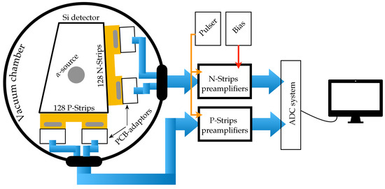 This section deals with the main blocks of the test bench, which are shown in schematic form in Figure 1. The fact of having a minimum number of electronic blocks on the test bench not only hugely reduces the electronic noise contribution but also make the system portable and economically viable. Briefly, the detector under test (DUT) was kept in a vacuum chamber ( mbar during data collection). With the use of an interface circuit (PCB-adaptor), the detector was connected to the cables that take the signals out of the chamber. These signals were fed into the preamplifiers and finally digitized for analysis. The DUT, the PCB-adapters, and the electronic chain are described in the following subsections. We proposed an acceptance–rejection detector test protocol, with the aim of providing the best quality detectors for our experiments.