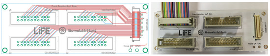 Design of the PCB-adaptor. Example of the layout of the traces (left) and photo of the manufactured prototype (right). Each PCB-adaptor can handle 64 strips.