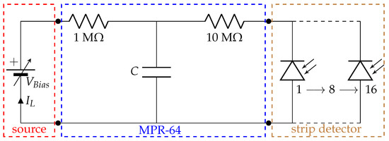 The different blocks or equipment used in the generation of the IV curve are depicted in Figure 5. The bias voltage source that we used is connected to the preamplifier (MPR-64) detector bias input, while the detector itself is connected to the preamplifier. The MPR-64 has four input stages (SubD25 female connector), and each stage has its own bias input that deals with 16 channels or strips at the same time. The is applied through a RCR network to each channel stage. The biasing resistors must be large enough to reduce electronic noise, and the bypass capacitor C shunts any external interference coming through the bias supply line to ground. It should be considered then that there will be a small voltage drop due to the biasing resistors, e.g., for a 100 nA current and 10 M resistors, the drop would be 1 V.
