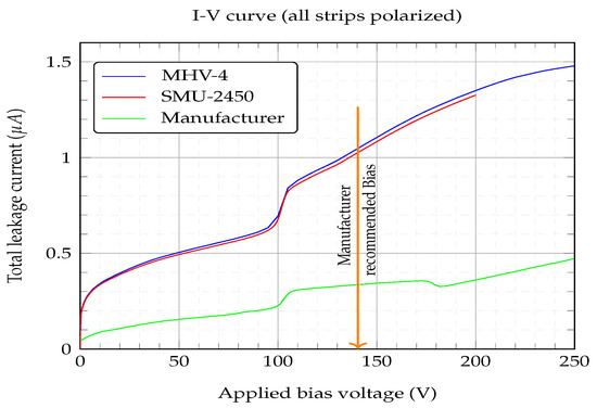 Figure 6 shows the values obtained for the total leakage current for a voltage range from 0 to 250 V. The values given by the manufacturer are also shown. Apart from the MHV-4 bias supply unit, a Keithley 2450 source measure unit (SMU-2450) was also employed to double check the readings given by the MHV-4 display, although the SMU-2450 was restricted to V. Three main points can be taken from the IV curves that were generated: (i) the differences between the leakage current values obtained and those given by the manufacturer were threefold, (ii) no significant difference could be seen when using any of the two bias sources, and (iii) the “hump” feature above 100 V. The manufacturer gave no information about how it measured the leakage current. However, the value given by the manufacturer of a total leakage current <A for a over-bias/depleted voltage of V was met. The obtained will be discussed later. The manufacturer recommended bias was 140 V, as depicted in the IV curve, Figure 6.