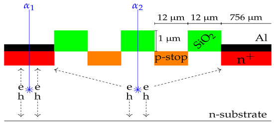Electrode structure (not to scale) for the ohmic side of the detector. The two insulating p implants (p-stops) can be seen between the n electrodes. Two scenarios are depicted: impinging on one electrode, and on the interstrip gap. The produced mobile charge carriers electron–hole (e-h) pairs are depicted.