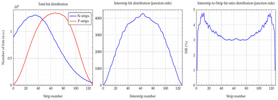Based on the statistics gathered by the acquisition system for all of the detector’s strips, we can also study the hit distribution generated by the impinging particles. Figure 11 left and middle pads show the bell-shaped distribution obtained for the total and interstrip hit distributions. Judging from the P-strip hit distribution, we can conclude that the -source was centered on the junction side (P-strips). However, the N-strip distribution was shifted to lower strip numbers. If we had found any deviations from this distribution, this would have alerted us to possible strip damage. It is also advisable to check for the interstrip hit distribution i.e., only hits on the SiO areas, which should also follow the same distribution, as shown in the middle pad. To obtain the interstrip distribution, we only counted the events on the hypotenuse of the energy-triangle. Furthermore, the interstrip-to-strip hit ratio (ISR) distribution can also be obtained by counting the events on one of the energy-triangle sides. The ISR distribution presents a U-shaped valley profile, as shown in Figure 11, right pad, which was due to both the relative size of the -source and the strip position above the detector, i.e., the solid angle of the source. For the irradiated area just in front of the particle source (strip 40 to 90), where the incident angle was basically zero (valley bottom), the ISR was about , i.e., 100 hits on the strip and only 3 on its interstrip. However, as the incident angle of the particles increased so did the ISR, reaching its maxima (nearly ) at the edges of the detector, i.e., about 5 hits on the interstrip and 100 on the strip. This, we believe, was caused by the shadow effect that the SiO areas (they rose m above the Al electrodes) may have over their neighboring electrodes at large incident angles.