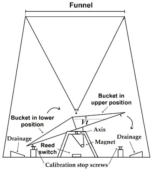 Among all the different rainfall measurement sensors, TBRs are the most widely used worldwide due to their simple manufacturing structure, which is based on an electric pulse, a magnetic reed switch mechanism, and a counter [2]. TBRs include a receiver (a funnel) that collects rainwater into a bucket, which is one-half of a two-bucket receptacle, pivoted on a cylindrical axis, that tips once the upper bucket fills up to a specified water amount (tipping volume, Vt) and raises the lower bucket into a position under the waterfall line, where it will begin to fill at the same time as the other bucket empties. In this movement, a magnet located in the tipping bucket mechanism generates an output signal through a magnetic reed switch to a recorder, and each pulse is set as a nominal amount of rainfall according to a fixed Vt, which can be set by two calibration stop screws (one for each bucket; Figure 1) [2,28,63].