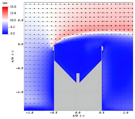 A sample section of the airflow field (velocity magnitude, Um (m s−1) along the vertical symmetry of a TBR at a horizontal wind speed of 10 m s−1 simulation. The arrows represent the time-averaged magnitude and direction of the airflow. Source: [78,85].