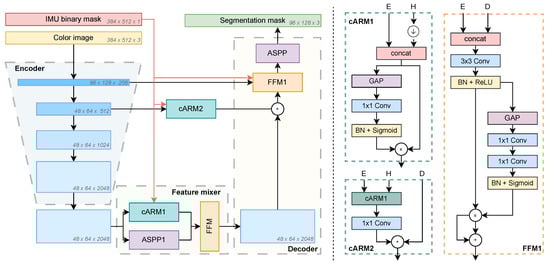 The WaSR architecture, summarized in Figure 1, contains three computational stages: the encoder, a feature mixer, and the decoder. The encoder is a ResNet-101 [] backbone, while the feature mixer and decoder are composed of several information fusion and feature scaling blocks. The first fusion block is called channel attention refinement module (cARM1 and cARM2 in Figure 1) [], which reweights the channels of input features based on the channel content. The per-channel weights are computed by averaging the input features across spatial dimensions, resulting in a feature vector that is passed through a convolution followed by a sigmoid activation. The second fusion block is called a feature fusion module (FFM) [], which fuses features from different branches of the the network by concatenating them, applying a convolution and a channel reweighting technique similar to cARM1 with convolutions and a sigmoid activation. The third major block is called atrous spatial pyramid pooling (ASPP) [], which applies convolutions with different dilation rates in parallel and merges the resulting representations to capture object and image context at various scales. The feature mixer and the decoder also utilize the inertial measurement unit (IMU) sensor readings in the form of a binary encoded mask that denotes horizon location at different fusion stages. In addition to the focal loss [] for learning semantic segmentation from ground-truth labels, Bovcon and Kristan [] proposed a novel water-obstacle separation loss to encourage the separation of water and obstacle pixels in the encoder’s representation space.