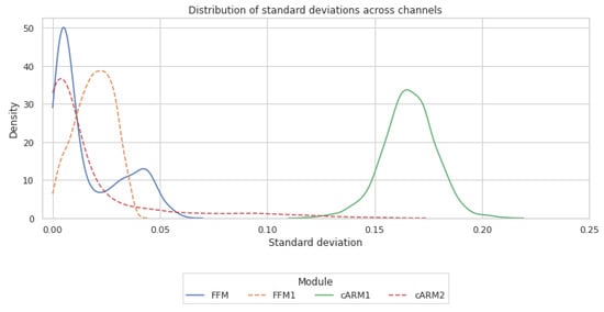 Distribution of per-channel standard deviations of channel re-weighting sigmoid activations across images of the MaSTr1325 training set in the cARM and FFM blocks. Lower standard deviation indicates that channels are given a similar weight in each image.