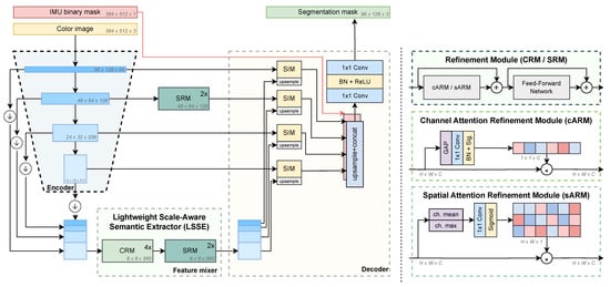 The eWaSR architecture follows the encoder, feature mixer, and decoder architecture. The backbone features of intermediate encoder layers are resized, concatenated, and processed by a lightweight scale-aware semantic extraction module (LSSE) consisting of channel refinement (CRM) and spatial refinement modules (SRM) visualized on the right. The semantically-enriched features are injected into higher-layer backbone features by semantic-injection modules [] (SIM). The resulting features are then concatenated with the IMU mask and passed to the segmentation head. We denote shapes of inputs, backbone features, and output in italics.